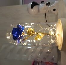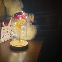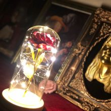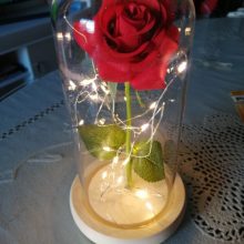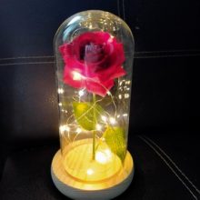 Die seidenrote Rose ist von LED-Leuchten umgeben, die, wenn sie eingeschaltet sind, eine so gemütliche und besondere Atmosphäre schaffen.