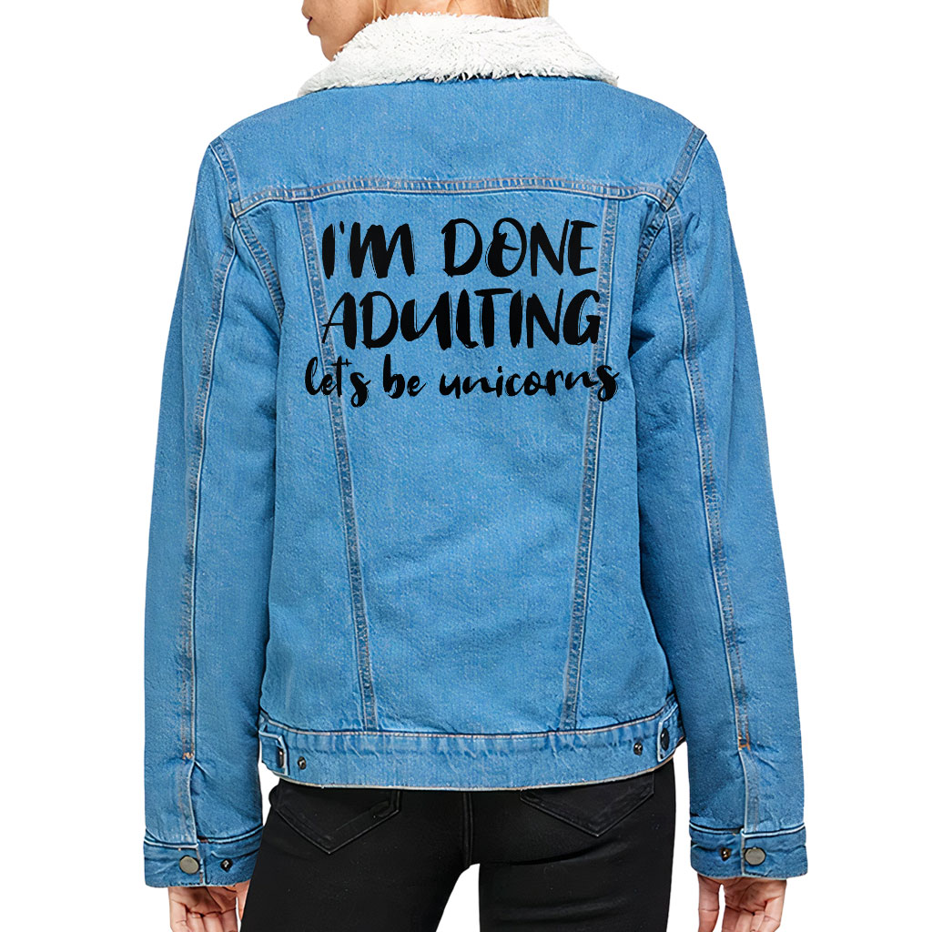 I’m Done Adulting Let’s Be Unicorns Women’s Sherpa Denim Jacket