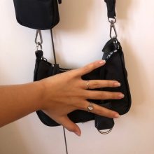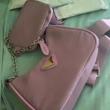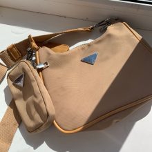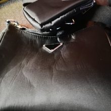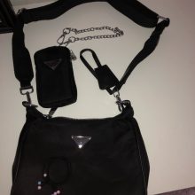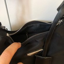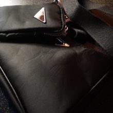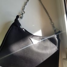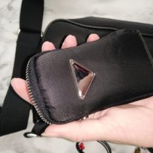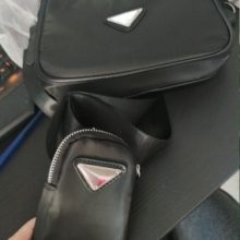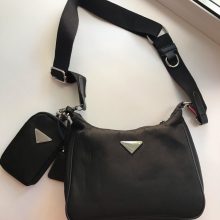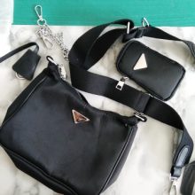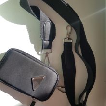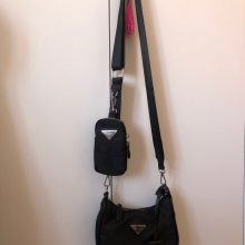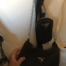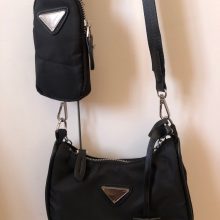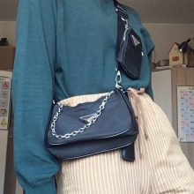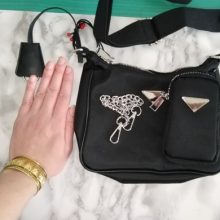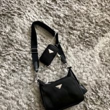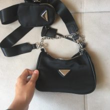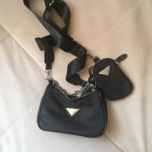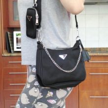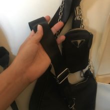 A bolsa designer crossbody casual vários bolsos e compartimentos que reúne um saco e uma bolsa para moedas. Formada em lona de nylon preta com padrão nas laterais dos dois bolsos, possui uma corrente de tons de prata removível e uma alça ajustável em jacquard para múltiplas opções de transporte.