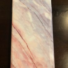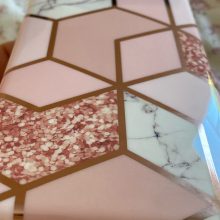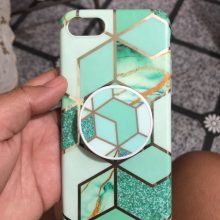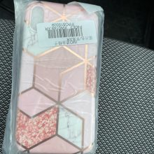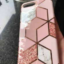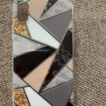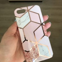 Capa de mármore geométrico para iPhone com uma camada dupla de cromo dourado e um padrão de mármore pastel com um para-choques transparente correspondente para maior proteção contra quedas!