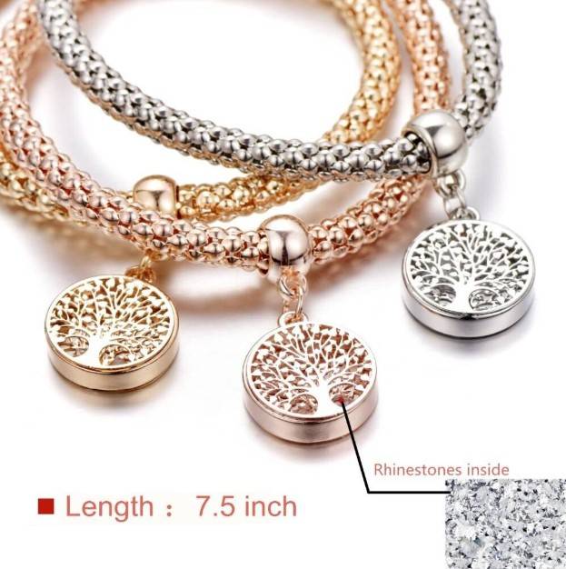 Absolutamente lindo trio de pulseiras “Árvore da Vida” com cristais austríacos em seus encantos!