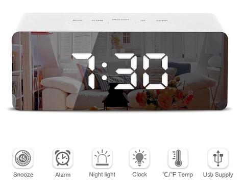O Relógio de Alarme Espelho Digital LED é multifuncional: Relógio despertador, Display de temperatura, função de luz noturna LED, espelho de maquiagem.